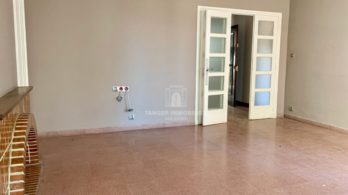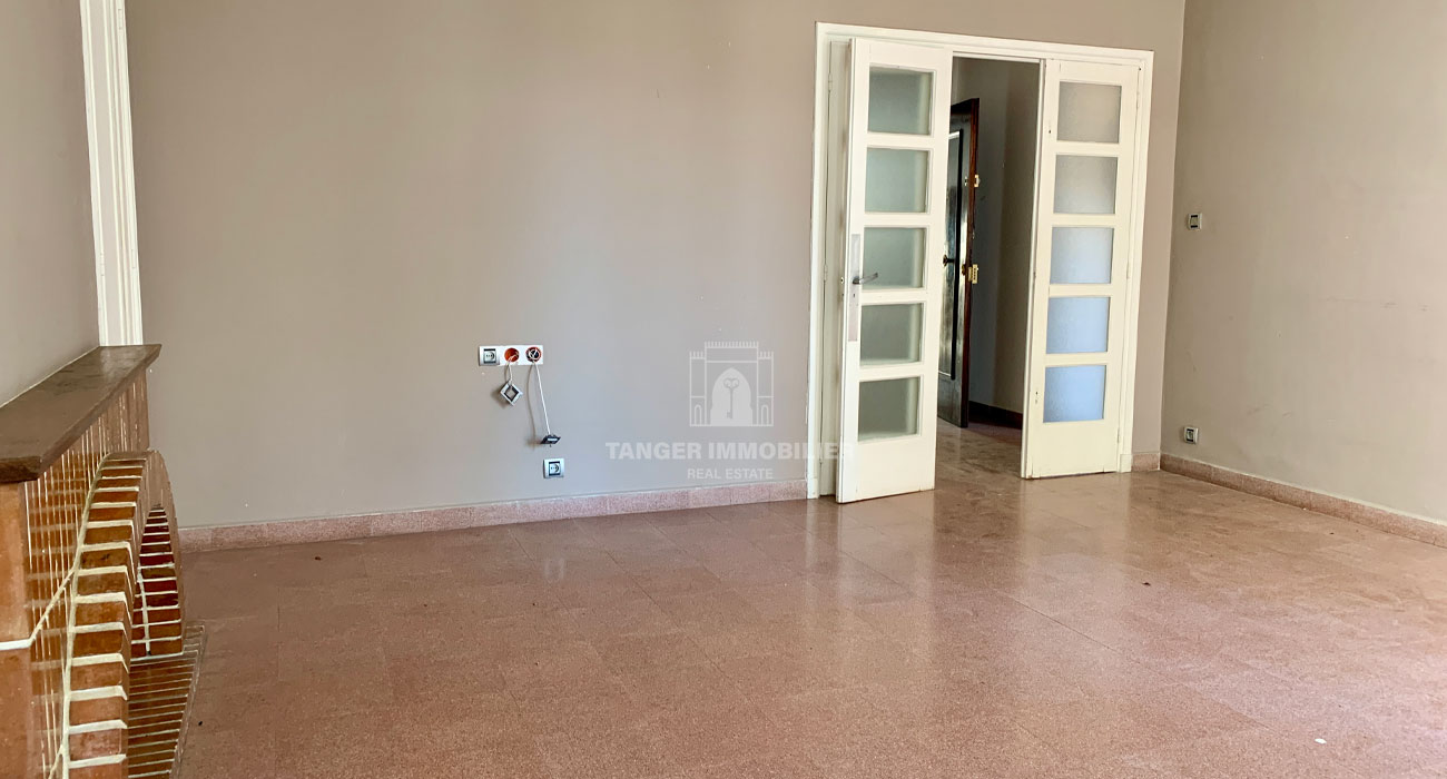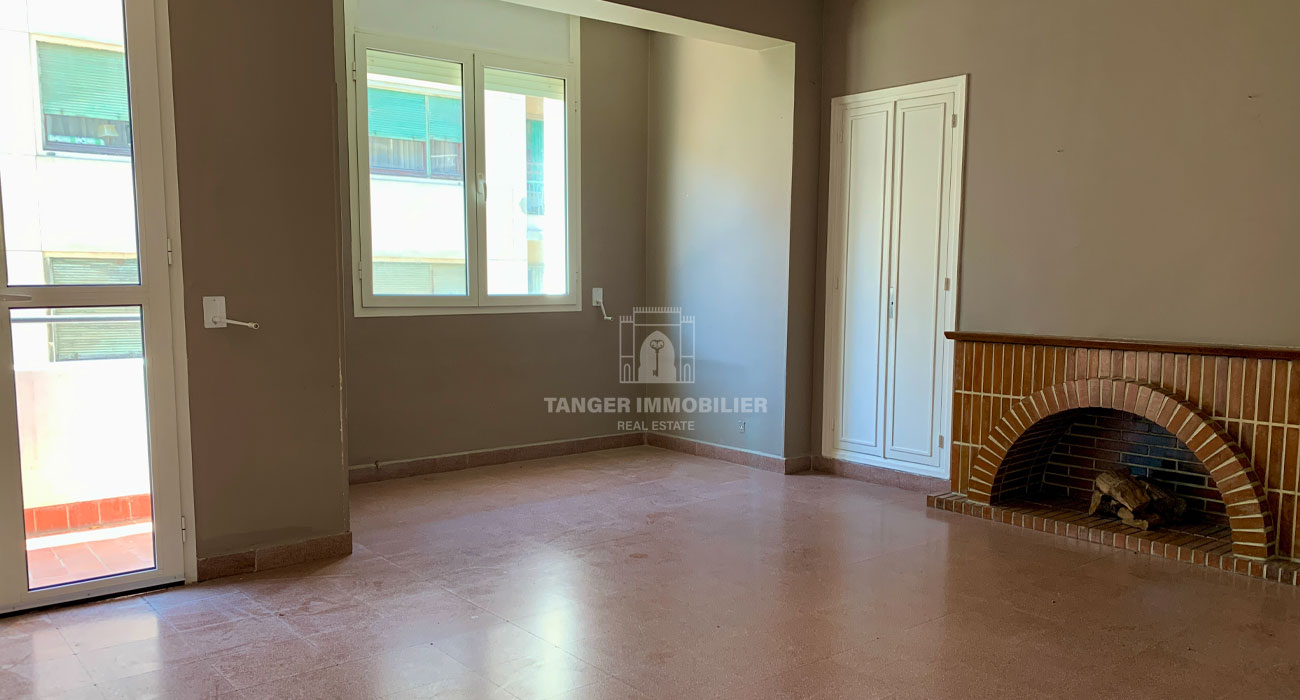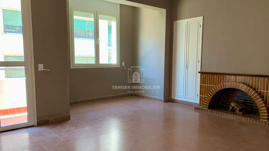 Salon avec cheminée, placards et accès balcon.